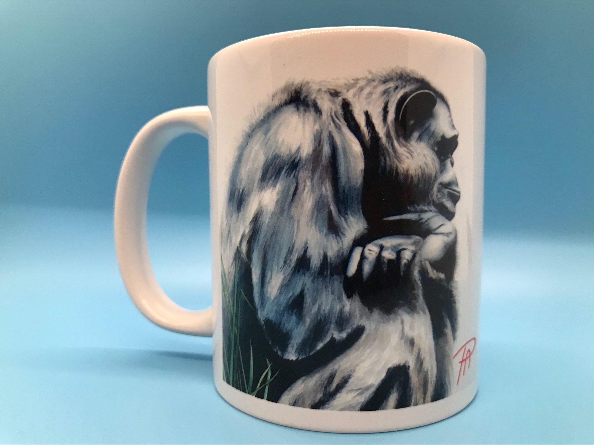 The Thinker mug features an image taken from an original Pauline Alldis watercolour depicting a chimpanzee deep in thought.