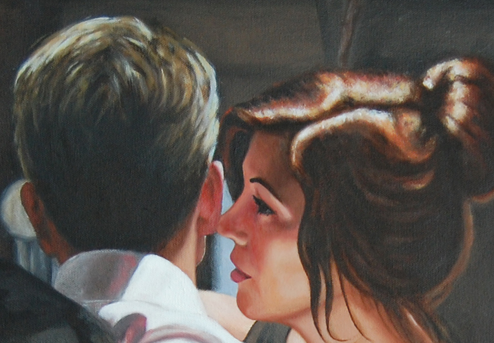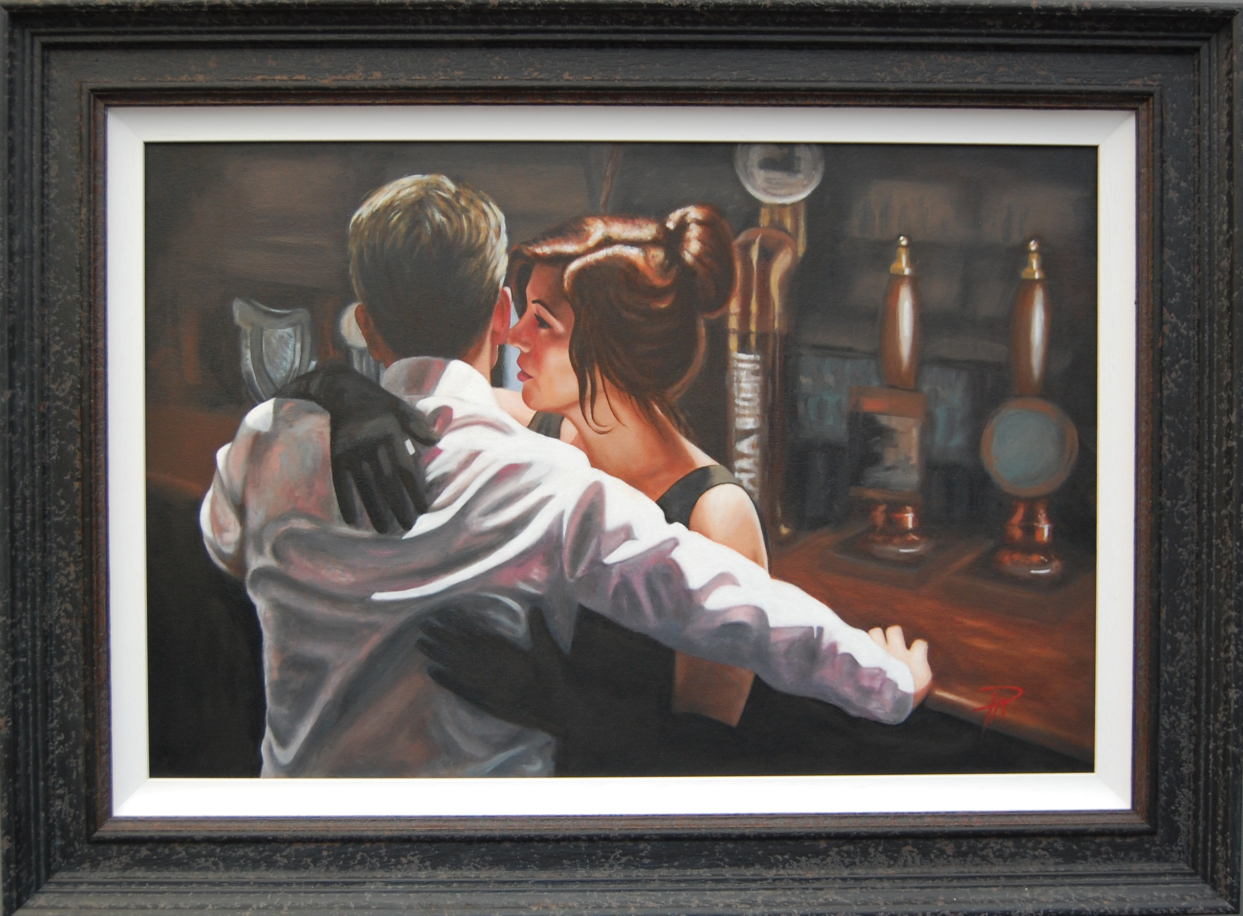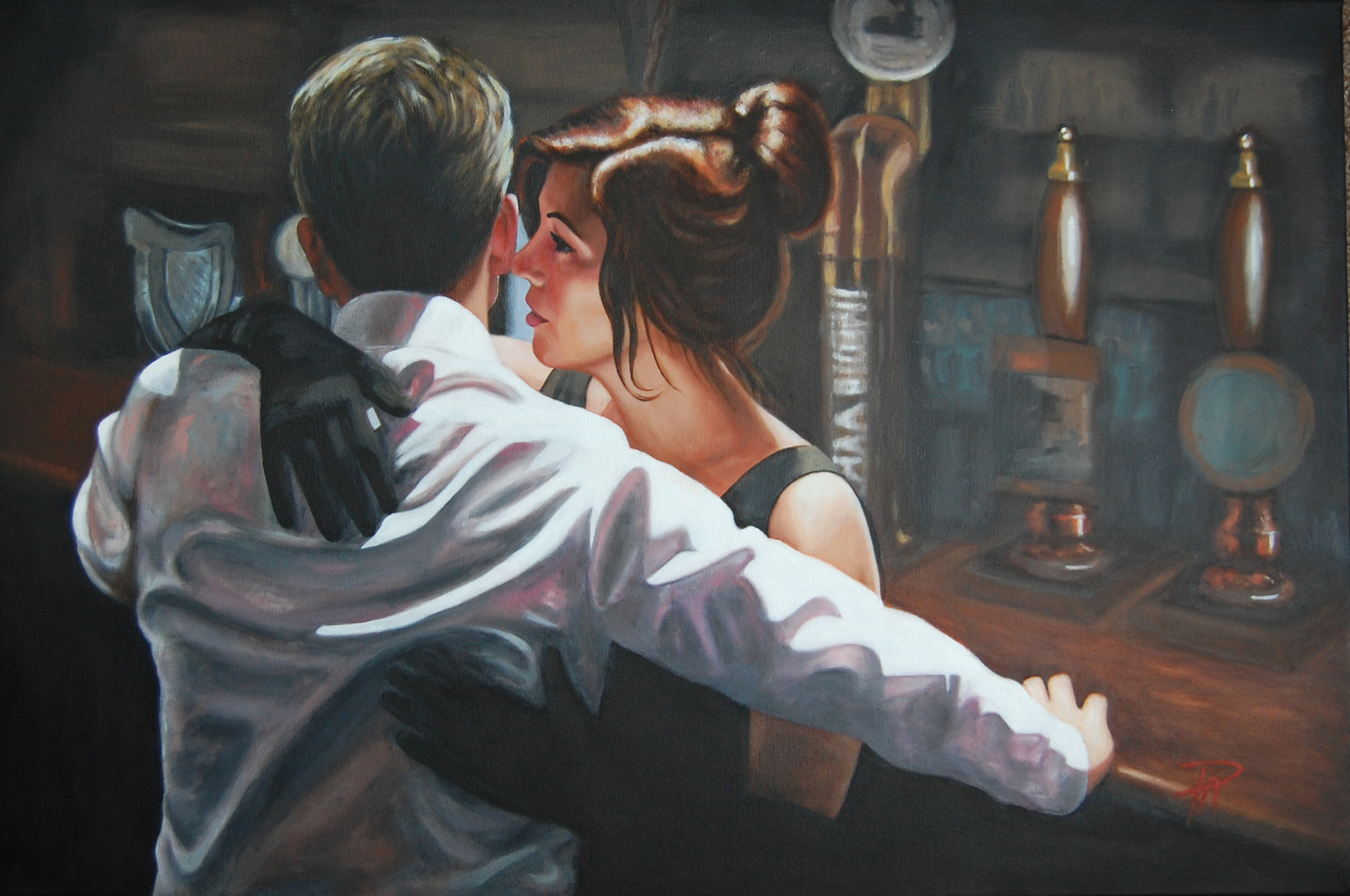 “Together At Last” is a new oil painting on canvas by Pauline Alldis. Completed during lockdown 2020, this wonderful painting depicts a loving couple enjoying a moment of togetherness at the bar. The viewers eye is drawn to the warm skin tones and detailed facial features of the young lady. This painting is framed and ready to hang.